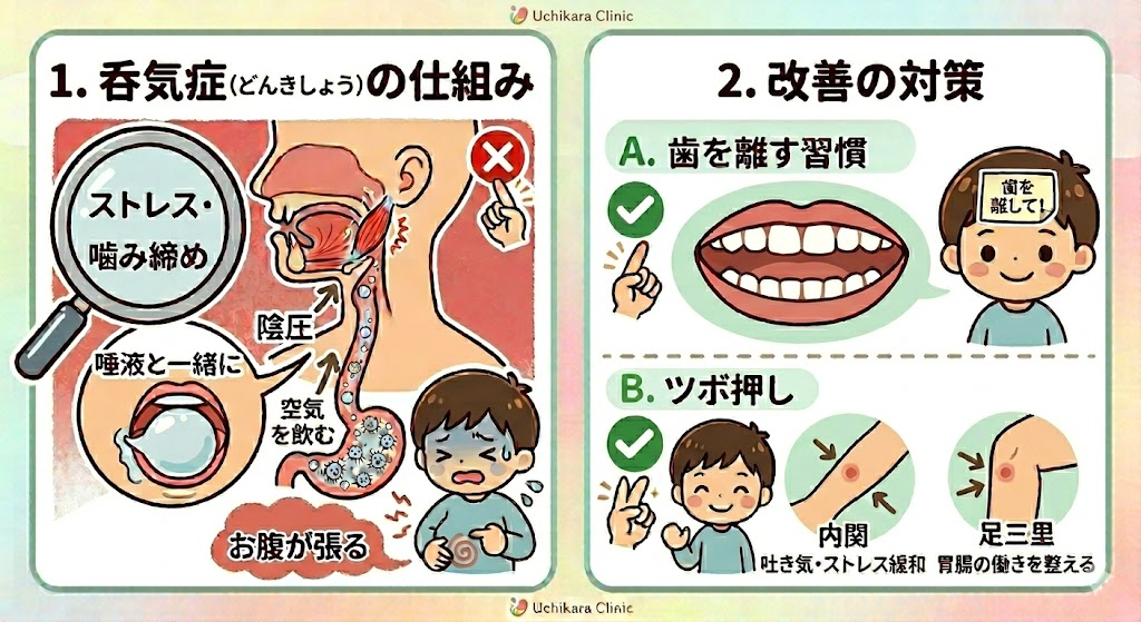 呑気症の治療は、「溜まったガスを出す」ことと「空気を飲まないようにする(リラックス)」の両面からアプローチします。