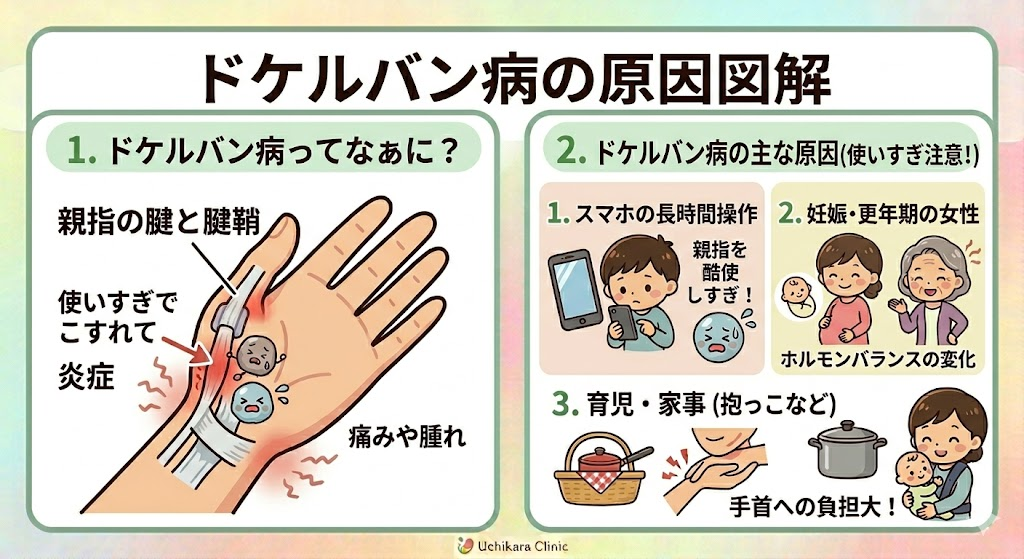 手首や親指の使いすぎによって起こりやすく、特にスマートフォンの長時間使用や育児(抱っこ)などで発症することがあります。