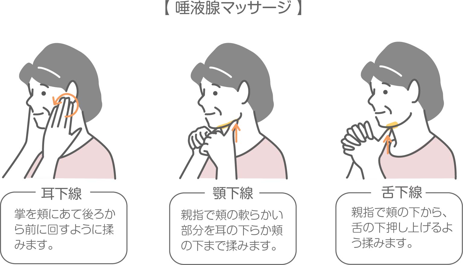 - 唾液腺マッサージ: 耳の下や顎の下をやさしくマッサージして分泌を促します。