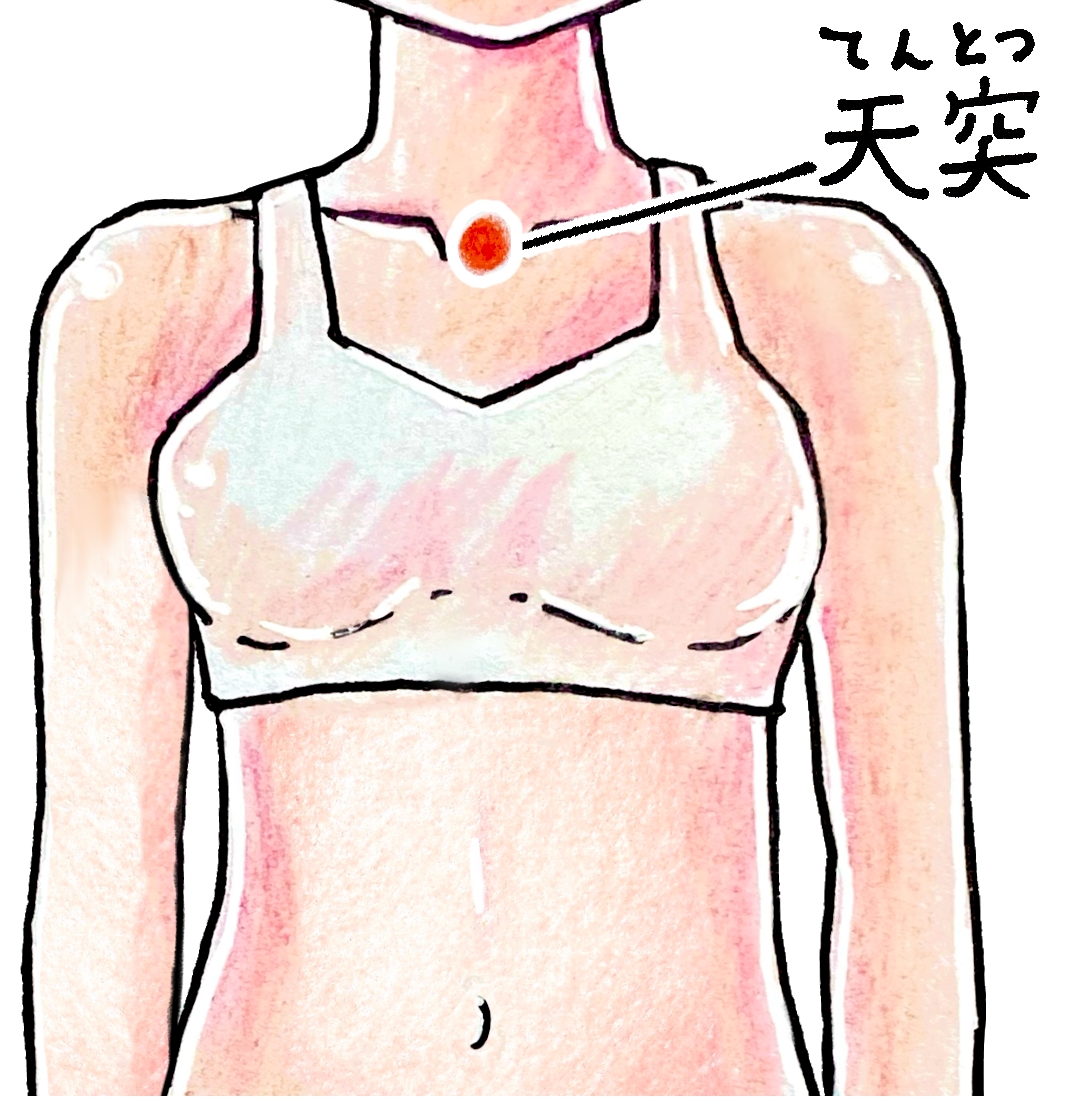 - 首のストレッチとツボ押し: 首の横や喉の周りを優しくさすったり、「天突(てんとつ:鎖骨の間)」などのツボを優しく押して、筋肉の緊張をほぐしましょう。