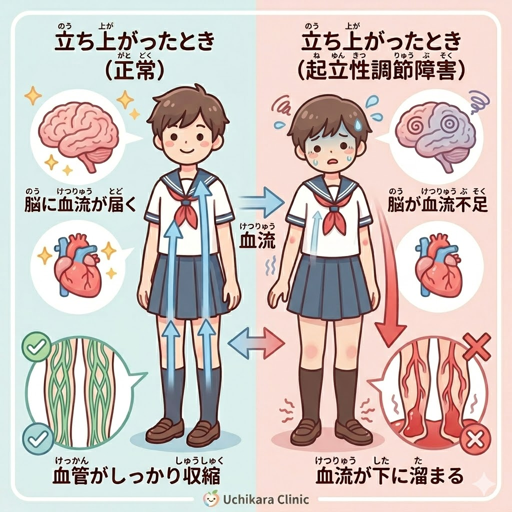 起立性調節障害とは、自律神経のバランスが崩れることで、立ち上がった時に脳や全身への血流が維持できなくなる病気です。