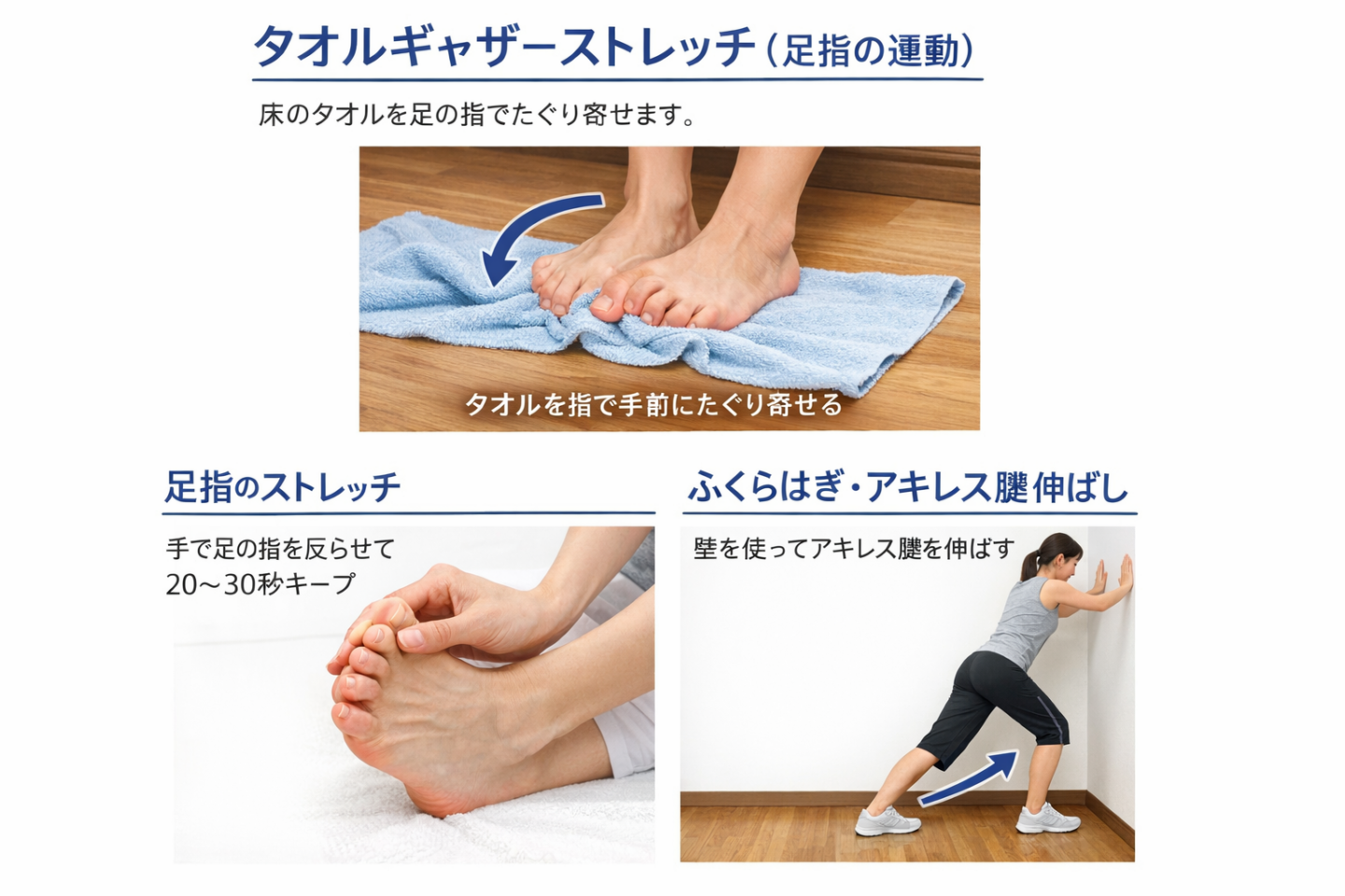 - ふくらはぎ・アキレス腱伸ばし: ふくらはぎが硬いと足裏が引っ張られて痛むため、壁を使ってアキレス腱をしっかり伸ばしましょう。