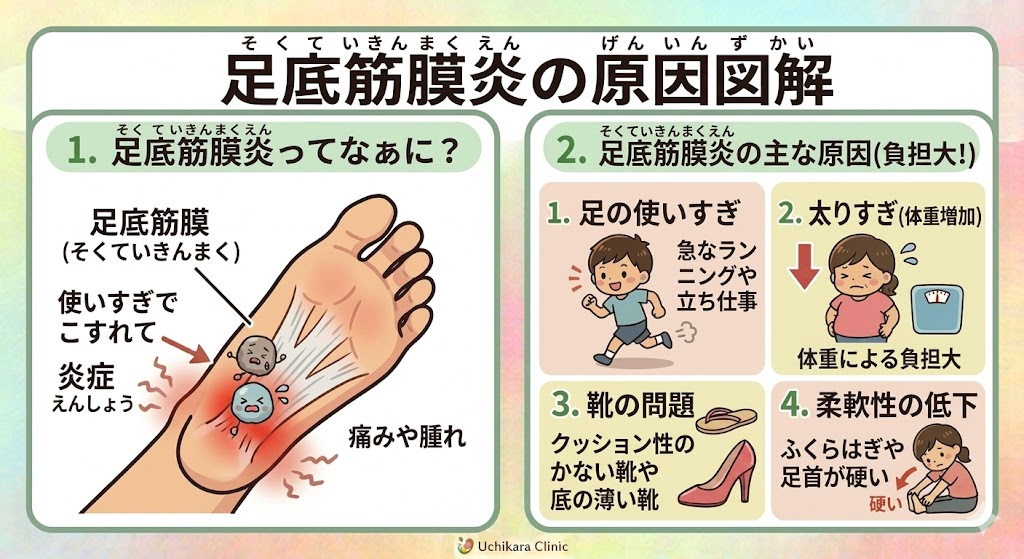 - 足の使いすぎ: 長時間の立ち仕事や、急に始めたランニングなどが負担になります。