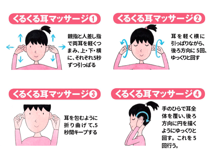 • くるくる耳マッサージ 両耳を軽くつまんで、上下横に引っ張ったり回したりします。耳周りの血流が良くなると、内耳のセンサーの過敏さが和らぎます。