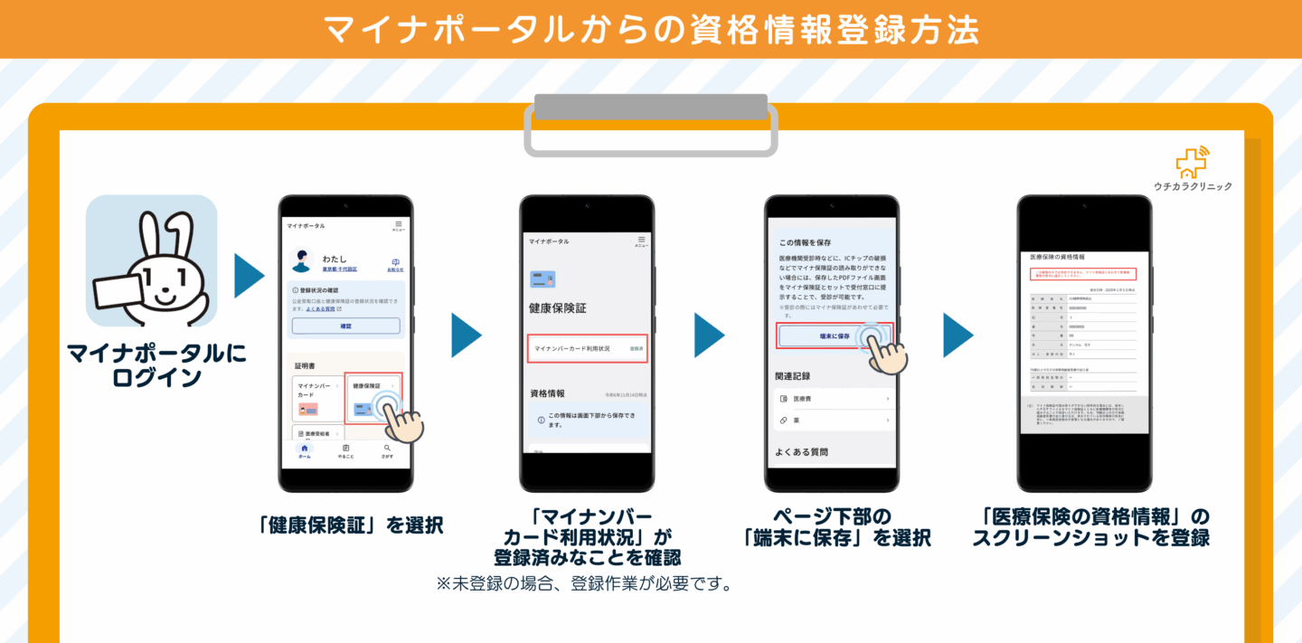 保険を適用するためには、保険証の提示が必要です。ウチカラクリニックでは、以下の方法で簡単にご登録いただけます。