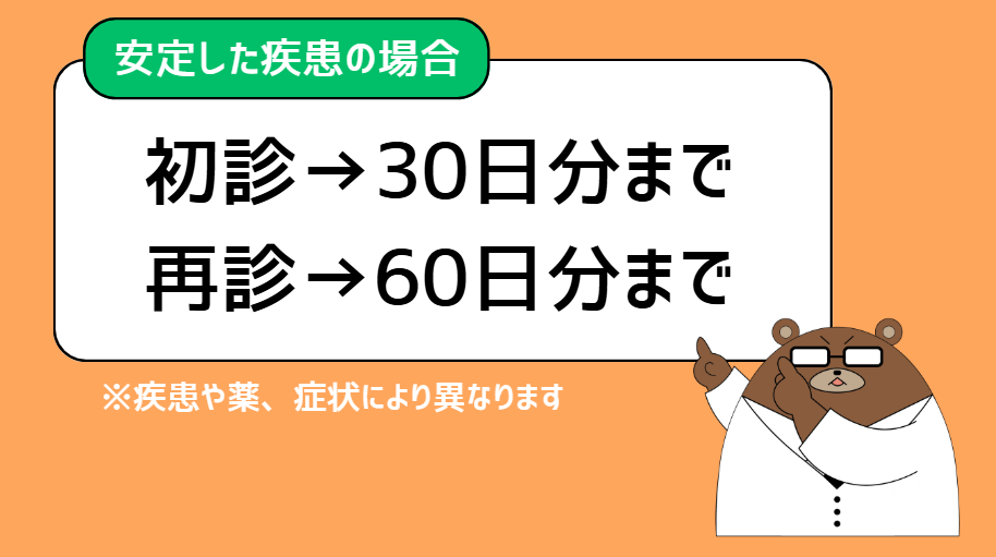 その上で基本的に安定している疾患の場合、初診は30日分まで、再診は60日分までの処方を行っております。