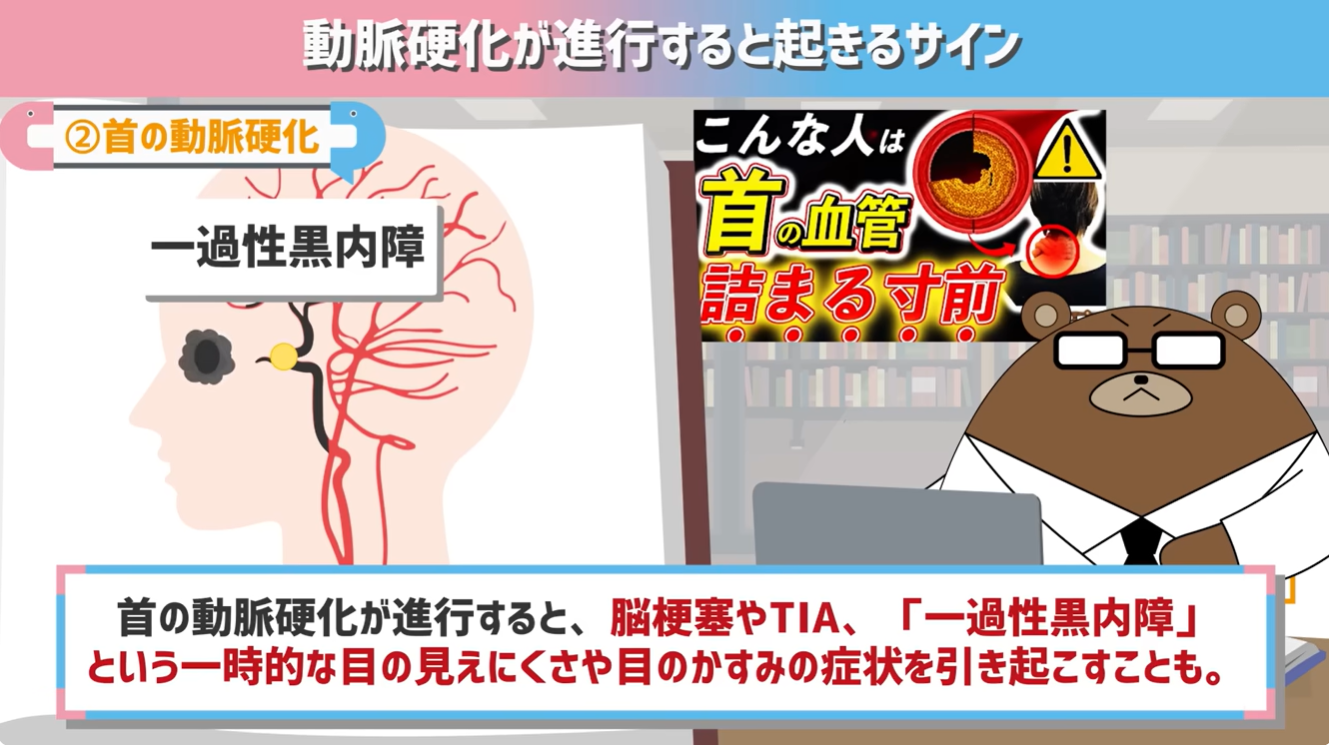 首の動脈硬化が進行すると、脳梗塞や先ほど紹介したTIAのような症状を引き起こしたり、