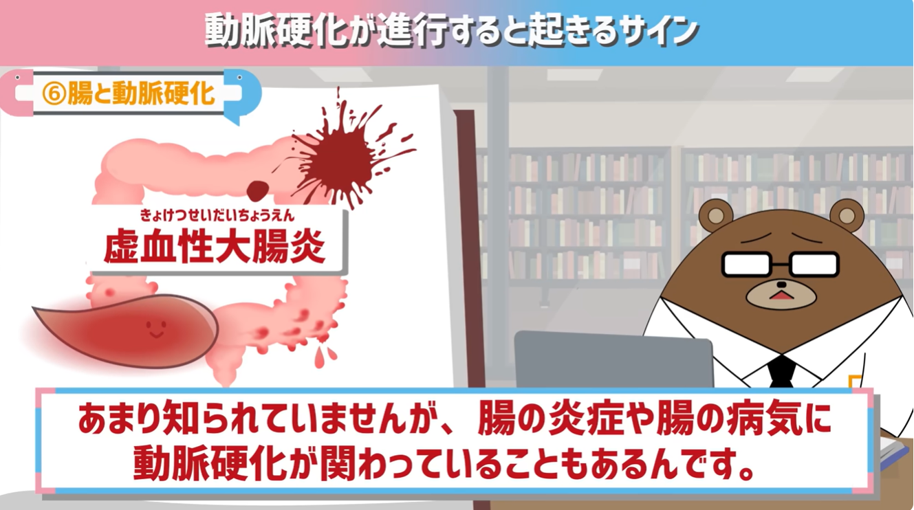 大腸に血液が十分届かなくなると、大腸の粘膜がただれて血便や腹痛を伴う「虚血性大腸炎」を発症することがあります。