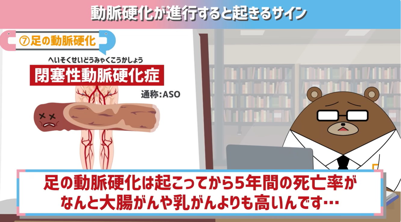 足の動脈硬化は、起こってから5年間の死亡率がなんと大腸がんや乳がんよりも高い。