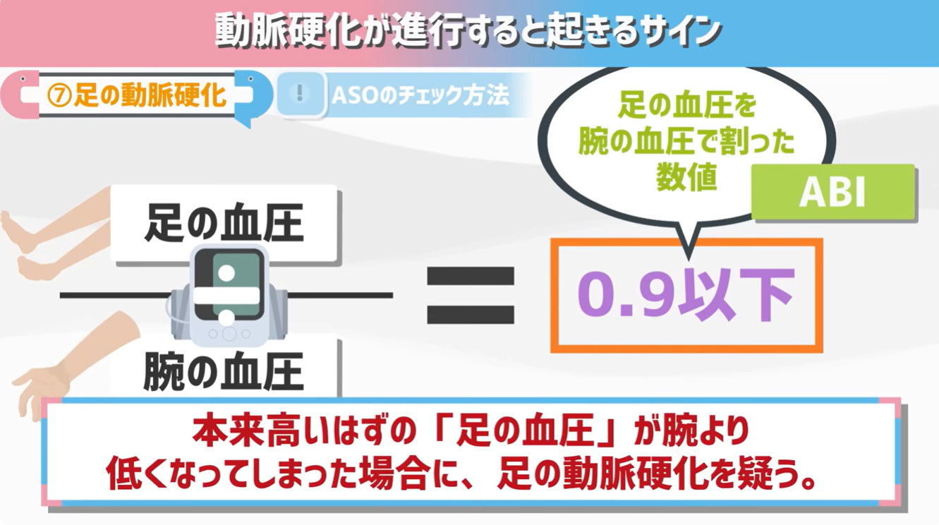 このABIが0.9以下、要するに本来高いはずの足の血圧が腕の血圧よりはっきり低くなってしまったよ、こういう場合に、足の動脈硬化を疑います。
