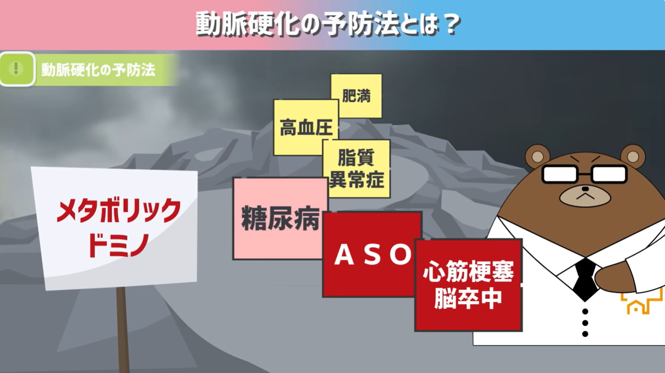 まず肥満の状態からはじまり、高血圧、脂質異常症、糖尿病といった連鎖が起き、最終的に様々な病気(ASO、心筋梗塞、脳卒中)に繋がっていく、この負の連鎖をドミノで表現したんですね。