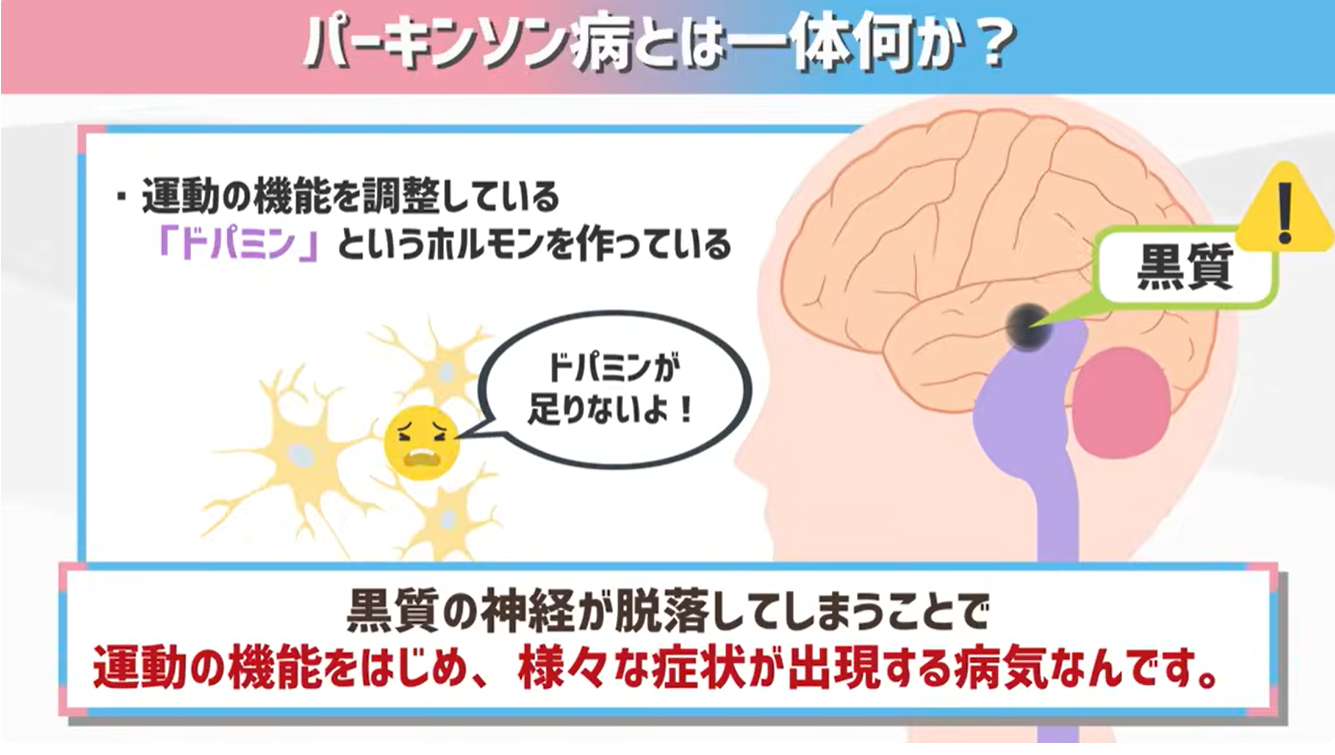 この黒質の神経が脱落してしまうことで、ドパミンがつくられる量が減り、運動の機能をはじめ、様々な症状が出現する病気なんです。