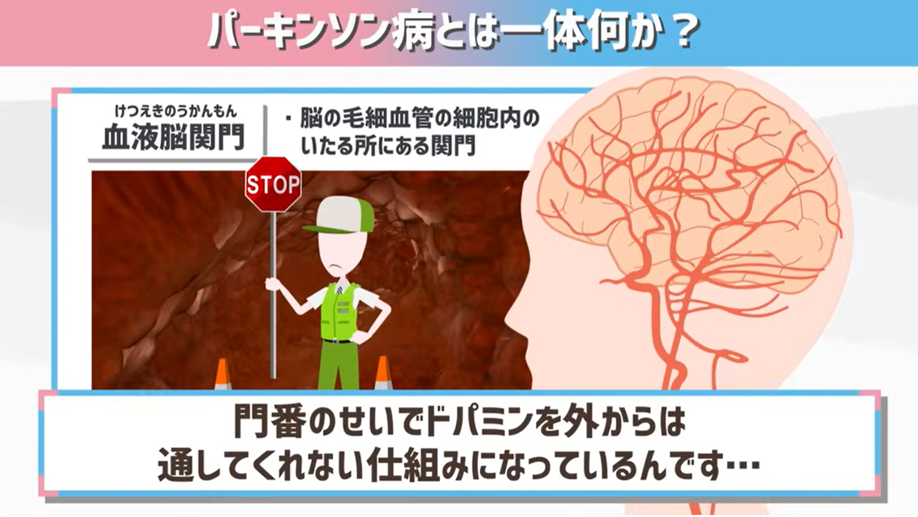 しかし、脳という場所は細菌やウイルスの侵入を防ぐ関所のような場所、専門用語で「血液脳関門」という場所があり、ドパミンを通してくれない仕組みになっているんです。
