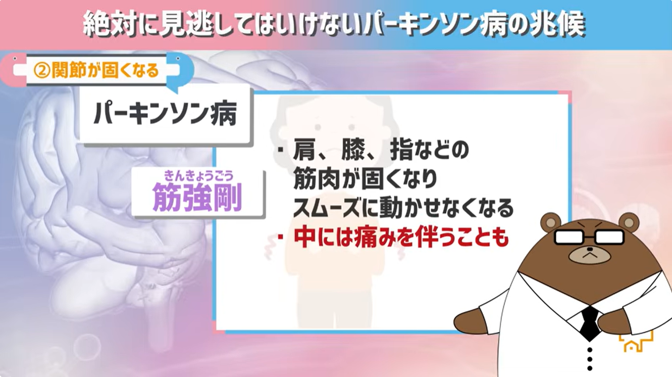 医学用語で「筋強剛」と呼ばれる症状なのですが、肩、膝、指などの筋肉が固くなり、スムーズに動かしにくくなり、中には痛みを伴うことも。