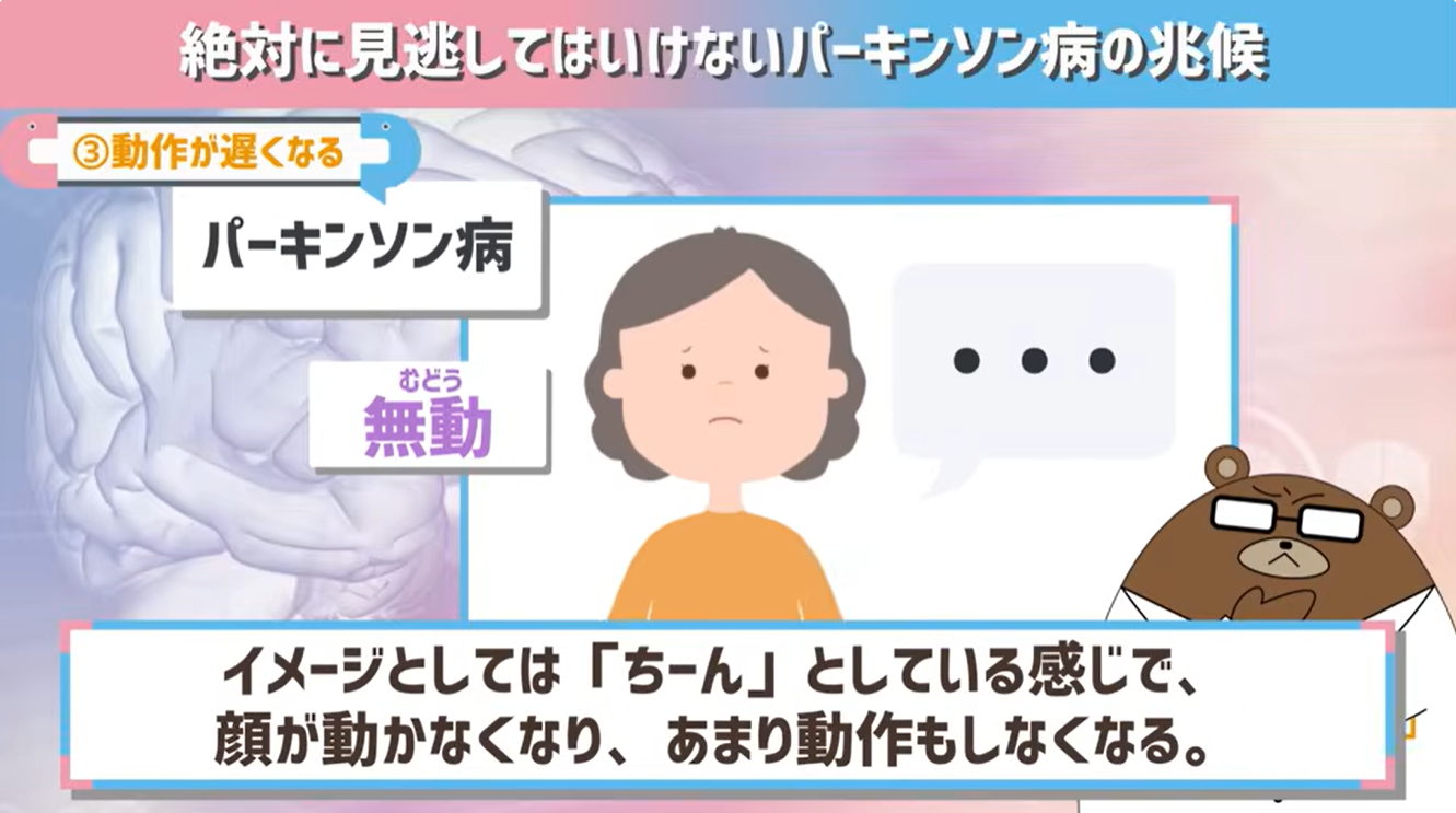このように動作が遅くなることは医学用語で「ブラディキネジア」といって、パーキンソン病でもしばしばみられるものです。