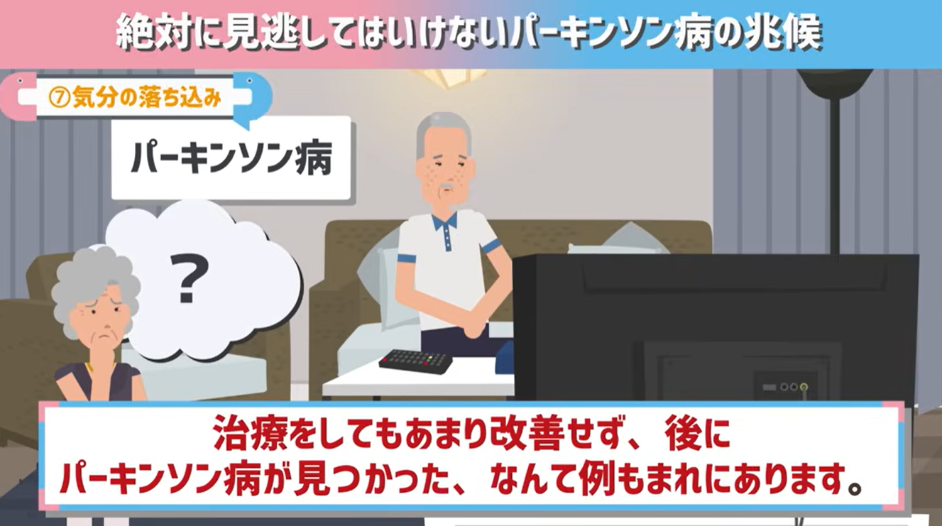 気分の落ち込みがきっかけでうつ病の診断となり、治療をしても改善せず、のちのちパーキンソン病が見つかった、なんて例もまれにあります。