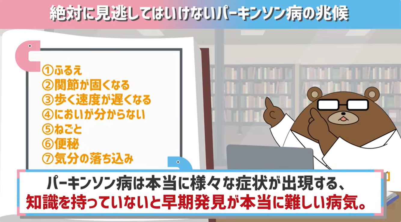 パーキンソン病では運動にまつわる体の症状から、におい、睡眠、メンタル、腸まで本当に様々な症状が出現しますし、知識を持っていないと早期発見が本当に難しい病気。