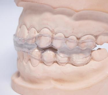 寝るときに専用のマウスピースを装着し、下の顎を少し前に出すことで、気道が塞がるのを防ぎます。