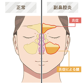 副鼻腔炎とは、鼻の奥にある空洞(副鼻腔)の換気が悪くなり、細菌が繁殖して膿(うみ)が溜まってしまう病気です。いわゆる「蓄膿症(ちくのうしょう)」のことです。