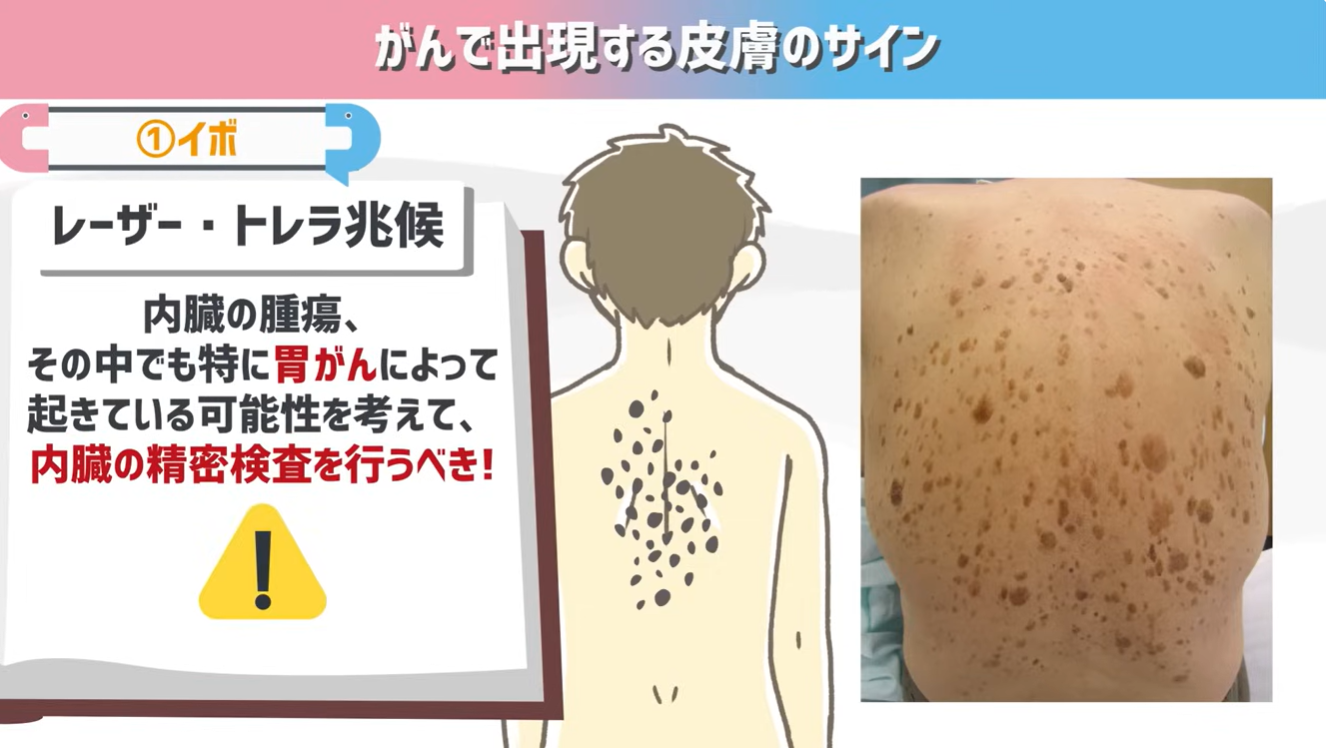 これは医学用語で「レーザー・トレラ兆候」と呼ばれる現象で、内臓の腫瘍、その中でも特に胃がんによって起きている可能性を考えて、内臓の精密検査を行うべきと言われている極めて重要なサインです。