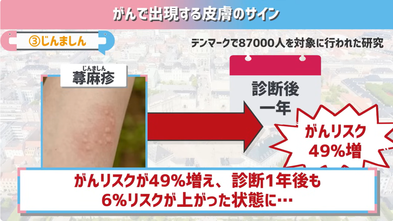 蕁麻疹と診断されたから1年で、がんになるリスクが49%増え、1年を超えた後も6%