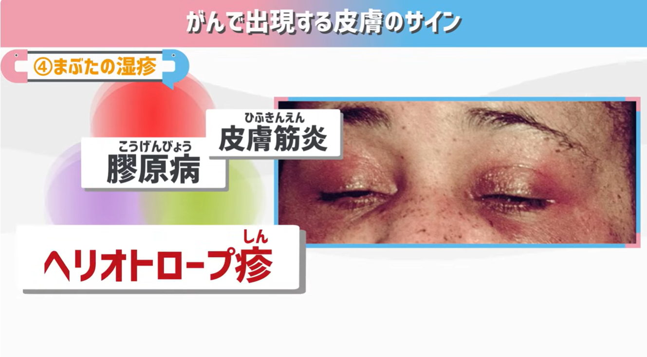 専門用語で「ヘリオトロープ疹」と呼びます。