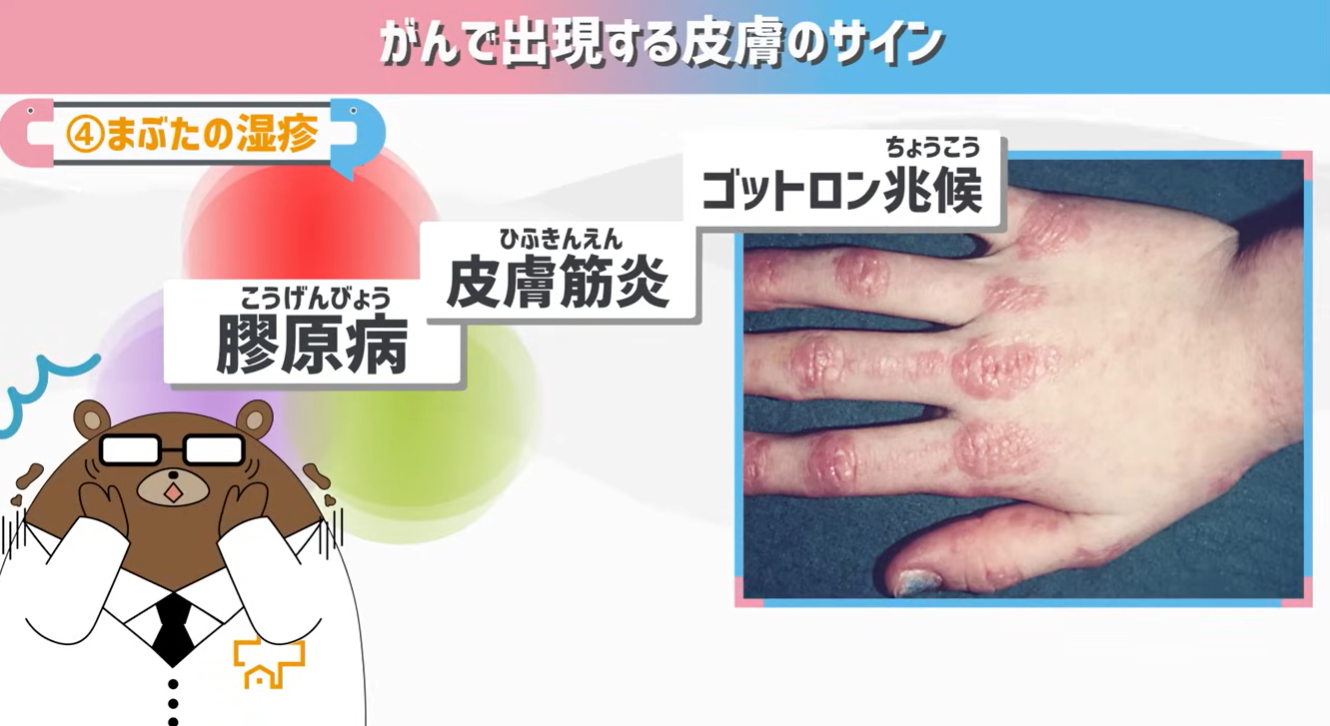 また皮膚筋炎では、手の指の関節の所に、表面ががさがさして盛り上がった赤い湿疹が出ることがあります。