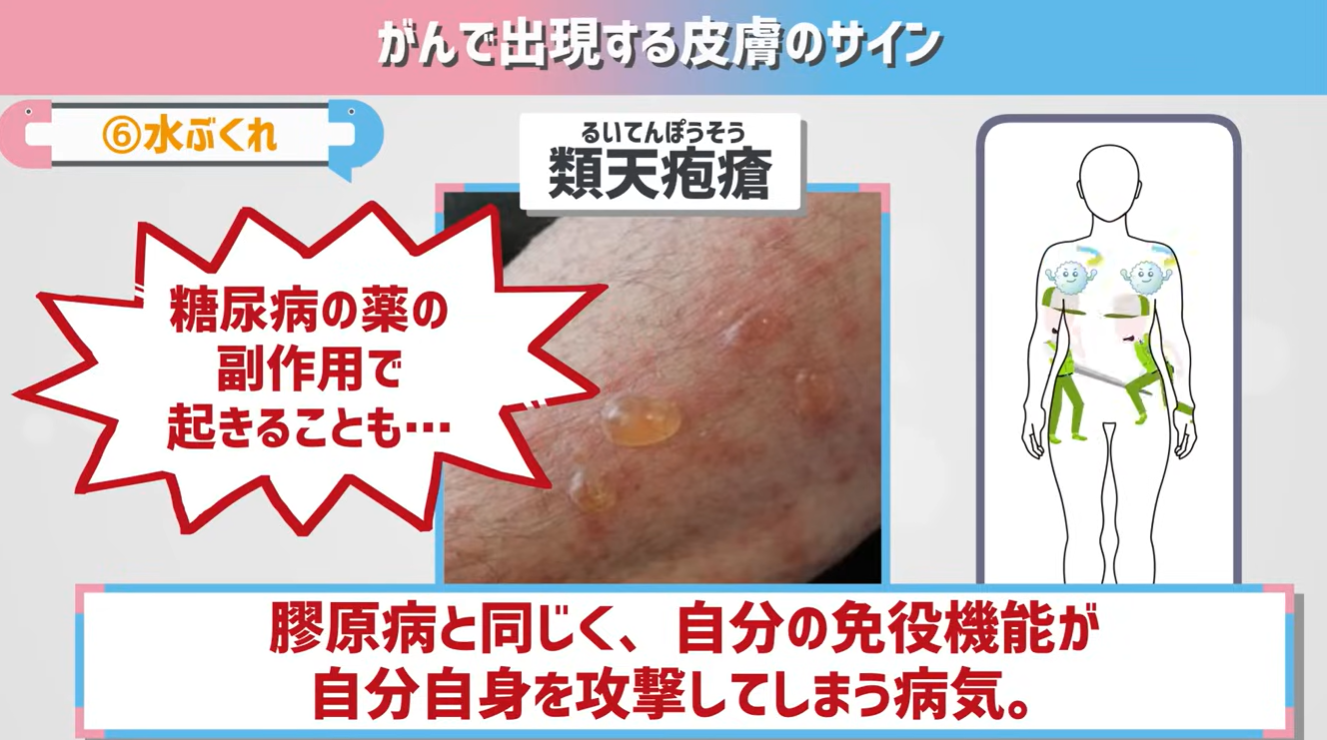 この病気の名前は「類天疱瘡」。先ほど紹介した膠原病と同じで、自分の免役機能が自分自身を攻撃してしまう病気。糖尿病の薬の副作用で起きることもあるんですね。