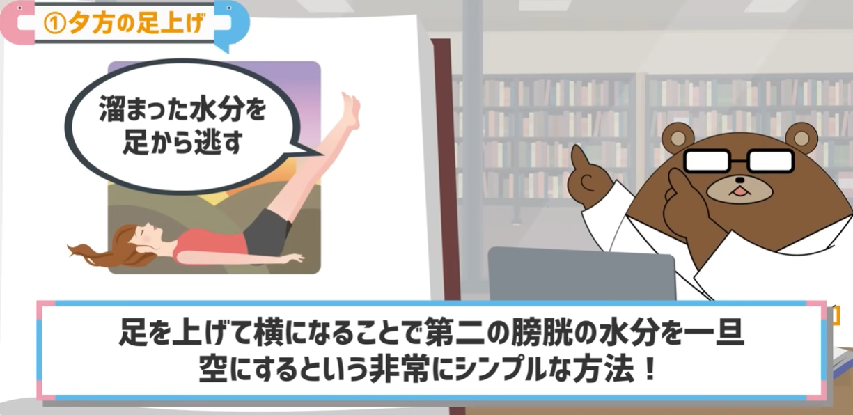 - 重力を利用して、足に溜まった水分をあらかじめ循環させておくことで、寝る前におしっことして出し切ることができます。